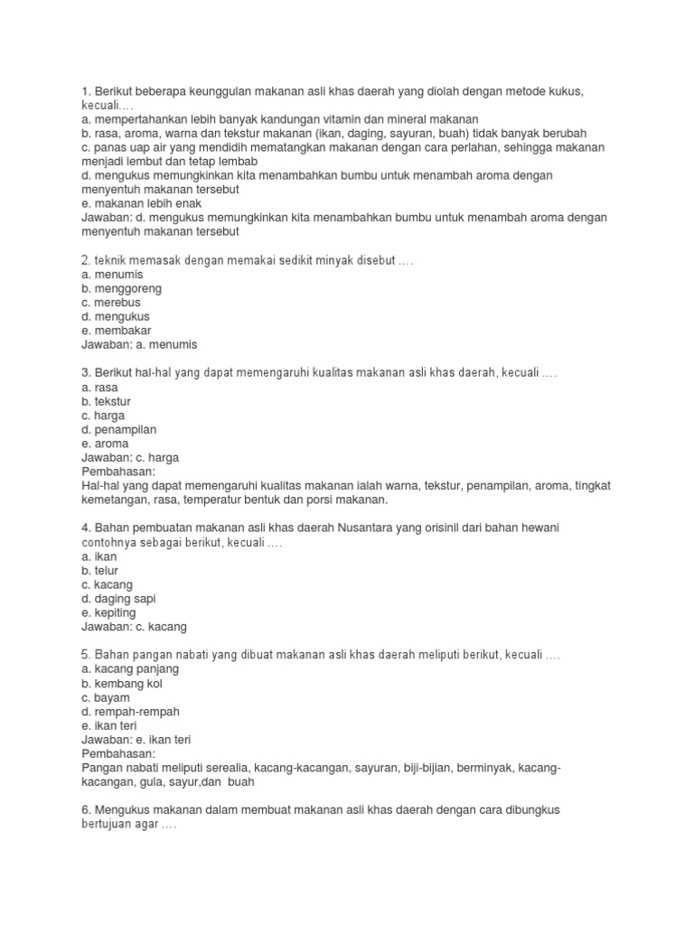 Soal Essay Tentang Wirausaha Pengolahan Makanan Khas Daerah Yang Dimodifikasi Masnurul from imgv2-1-f.scribdassets.com Jan 05, 2021 · bahan pembuatan makanan asli khas daerah nusantara yang orisinil dari bahan hewani contohnya sebagai berikut kecuali. Bahan pembuatan makanan asli khas daerah nusantara yang orisinil dari bahan hewani contohnya sebagai berikut, kecuali …. Feb 10, 2020 · 64. Apr 26, 2018 · 1.berikut tidak termasuk bahan pembuatan makanan asli khas daerah nusantara yang orisinak dan bahan hewani contohnya adalah. Makanan khas daerah adalah makanan dan minuman yang biasa dikonsumsi oleh masyarakat tertentu, dengan citarasa khas yang diterima oleh masyarakat. Latihan soal usbn pengolahan makanan internasional unknown 2202018. Rasa, aroma, warna dan tekstur makanan (ikan, daging, sayuran, buah) tidak banyak berubah. Bahan pembuatan makanan asli khas daerah nusantara yang orisinil dari bahan hewani contohnya sebagai berikut, kecuali ….
